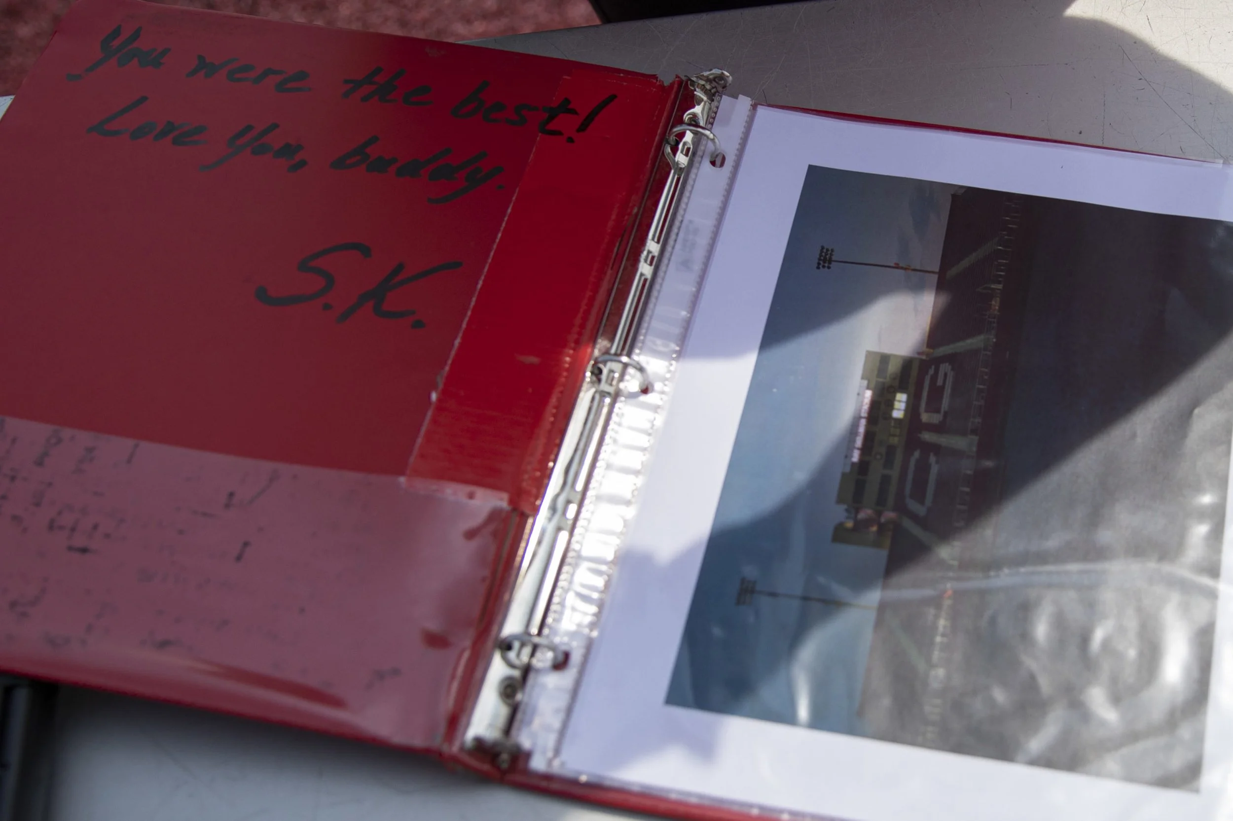 Hannah Mueller, opens up her husband Jason’s public address announcer binder showing a message from Scott Knapp, athletic director at CGHS Aug. 8, 2021, on the field at Ray Skillman Stadium at Center Grove High School in Greenwood.